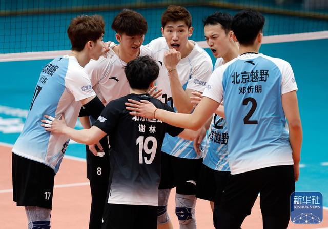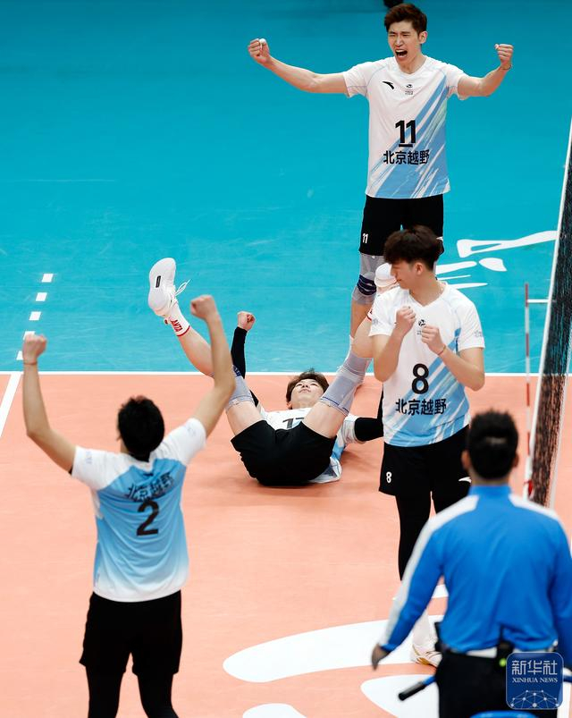 ↑ 北京北汽队在比赛后庆祝获胜。新华社发(马子涵摄)