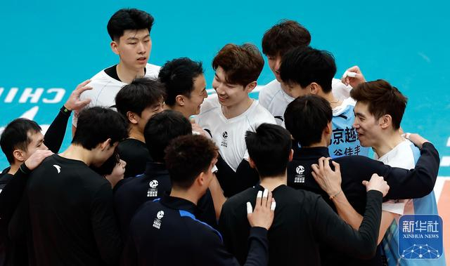 ↑ 保定沃隶队球员隋翔宇、康斯坦丁、辛尼察(前排从左至右)在比赛中拦网北京北汽队球员江川。新华社发(马子涵摄)