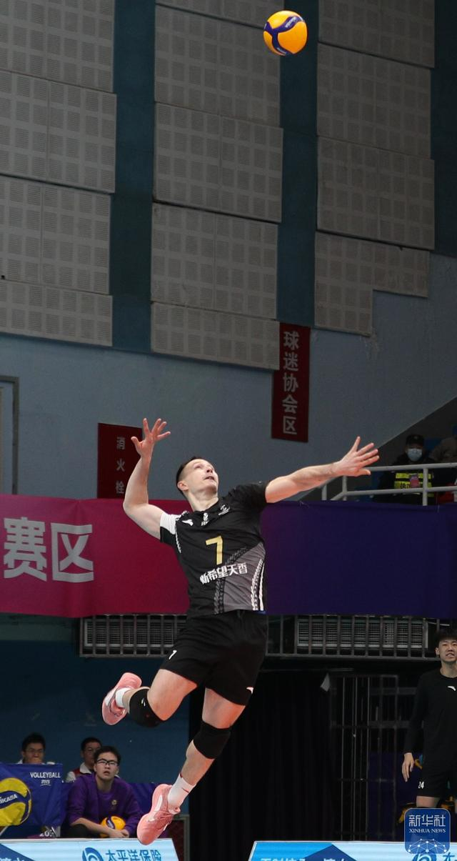 ↑ 保定沃隶队球员辛尼察在比赛中发球。新华社发(马子涵摄)