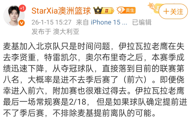 之前媒体报道了北京首钢接触了麦基,但有很大的变数,根据最新消息,麦基加盟北京首钢只是时间问题了,由于大概率无缘NBL季后赛,所以麦基有可能提前离队,甚至有可能在第一阶段就加盟北京首钢。